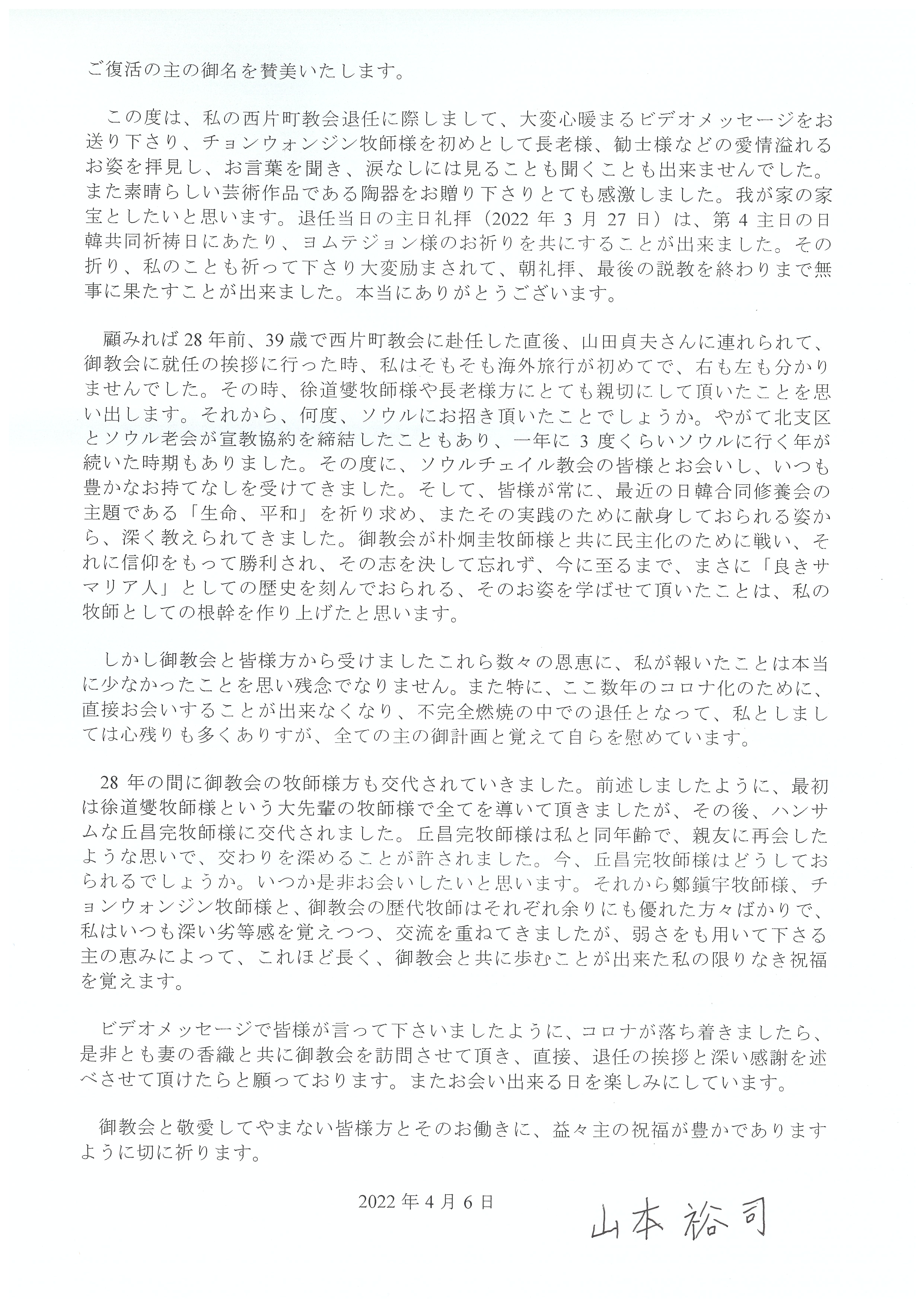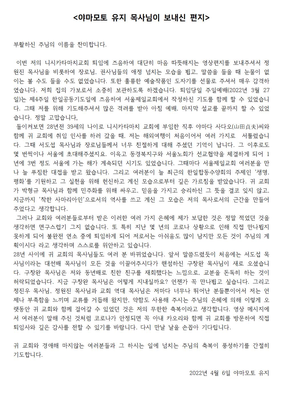 Áö³ 3¿ù 27ÀÏ(ÁÖÀÏ), ´Ï½ÃīŸ¸¶Ä¡±³È¸ ´ãÀÓ¸ñ»çÀ̽оߏ¶¸ðÅä À¯Áö ¸ñ»ç´ÔÀÇ ÅðÀÓ½ÄÀÌ ÀÖ¾ú½À´Ï´Ù. ¾ß¸¶¸ðÅä À¯Áö ¸ñ»ç´ÔÀº ¿ì¸®±³È¸¿Í ÀڸŰü°è¿¡ ÀÖ´Â ÀϺ» ´Ï½ÃīŸ¸¶Ä¡±³È¸ÀÇ ´ãÀÓ¸ñ»ç·Î ¾à 30¿©³â°£ ½Ã¹«ÇÏ¸é¼ ÇÑÀÏ ¾ç±³È¸ÀÇ ±³·ù¿Í Çù·ÂÀ» À§ÇØ Èû½á ¿À¼Ì½À´Ï´Ù. ¿À·£ »ç¿ªÀ» ¸¶Ä¡½Ã¸ç ¼ö°íÇϽоߏ¶¸ðÅä À¯Áö ¸ñ»ç´Ô°ú Àڸű³È¸ ´Ï½ÃīŸ¸¶Ä¡±³È¸¸¦ °Ý·ÁÇϰí ÃàÇÏÇϱâ À§ÇØ ÅðÀӽĿ¡ Âü¿©ÇÏ·Á ÇßÁö¸¸, ÇöÀç Äڷγª ¹æ¿ªÁöħ »ó ÀϺ»¿¡ °¥ ¼ö ¾ø´Â »óȲÀ̶ó ´ë½ÅÇØ¼ ±³¿ìµéÀÇ ¸¶À½À» ´ã¾Æ ¿µ»óÆíÁö¿Í ¼±¹°À» Àü´ÞÇÏ¿´½À´Ï´Ù. ÀÌ¿¡ ¾ß¸¶¸ðÅä À¯Áö ¸ñ»ç´Ô²²¼ ÅðÀÓ½ÄÀ» ¸¶Ä¡°í ¿ì¸®±³È¸¿¡ °¨»çÆíÁö¸¦ º¸³»Áּż ÇÔ²² °øÀ¯ÇÕ´Ï´Ù. (¹ø¿ªÀº ¿°ÅÂÁ¤ ±Ç»ç´Ô²²¼ ¼ö°íÇØÁּ̽À´Ï´Ù.)